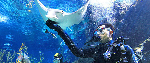 Diving with the sharks Get even closer to the sharks, stingrays and many colorful species of tropical fish taking a dive accompanied by a Ocean World trainer.